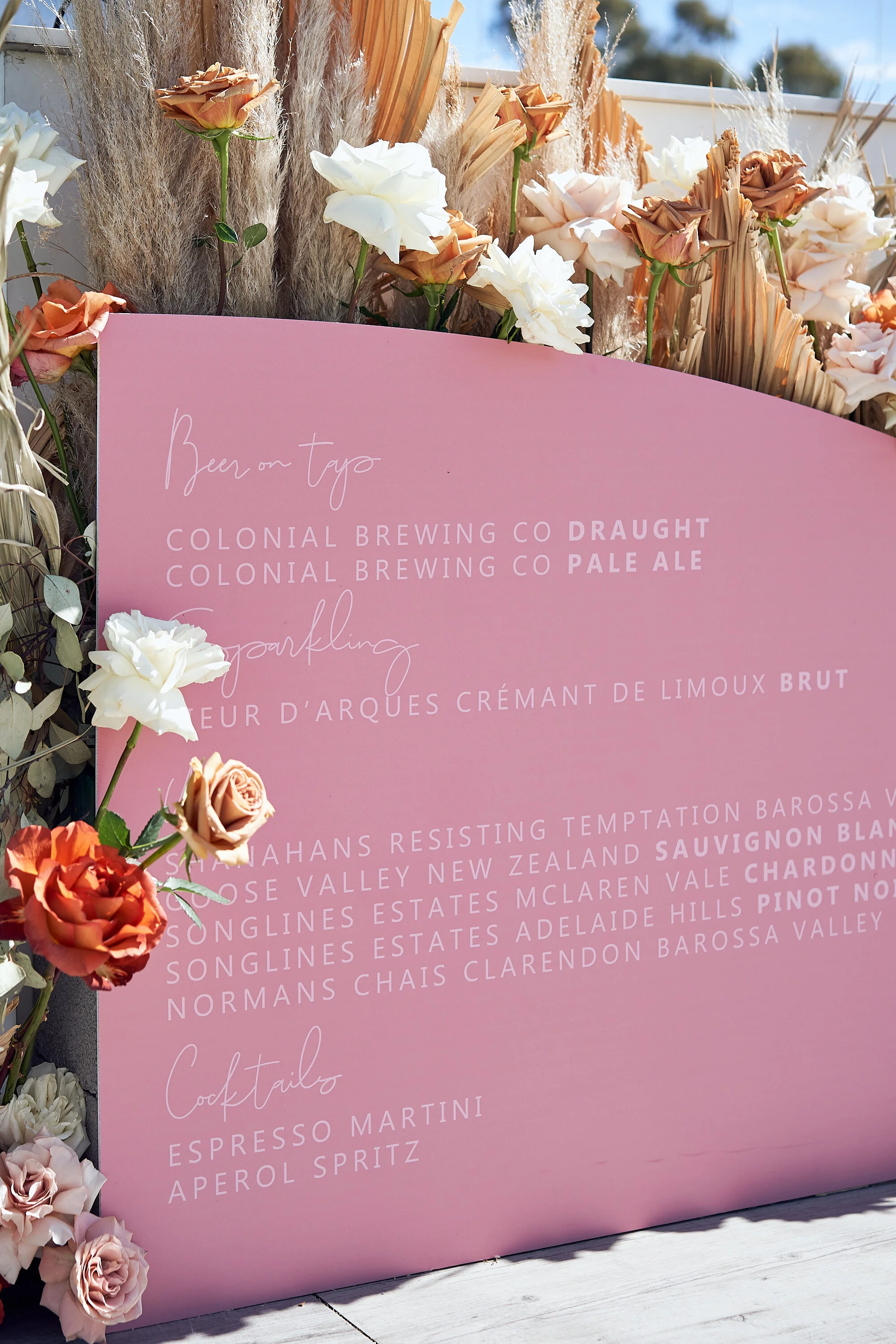 THE PERFECT SETTING BEGAN WITH THE PERFECT CEREMONY LOCATION ON THE MILLER FARM. A BESPOKE BUILT WHITE CEREMONY STAGE AND AISLE IN FRONT OF THE PICTURESQUE LAKE. LAYERS OF PAMPAS, DRIED GRASS AND DREAMY ROSES GREW FROM THE GROUND FRAMING THE “I-DO” MOMENT. GUESTS MOVED INTO THE BOHEMIAN INSPIRED FAIRHAVEN MARQUEE WHERE A BEAUTIFUL YET RELAXED LOOK WAS CREATED WITH EARTHY AND TEXTURAL PIECES OF WOVEN CHAIRS, RATTAN GRAZING BOARDS, ORGANIC COTTON NAPKINS AND COPPER CUTLERY. THE BRIDAL PARTY DINED UNDER AN AUSTRALIANA INSPIRED FEATURE INSTALLATION THAT SUSPENDED WOODEN BEADED CHANDELIERS AMONGST NATIVE GUM FOLIAGE AND PRESERVED FLORALS THAT TIED BACK TO THE STUNNING PROPERTY SURROUNDINGS. FAIRY LIGHTS TWINKLED OVER THE DANCEFLOOR AND CURTAINED DOWN BEHIND THE CUSTOM 14 METRE BAR CREATING A TRULY MAGICAL AMBIENCE.