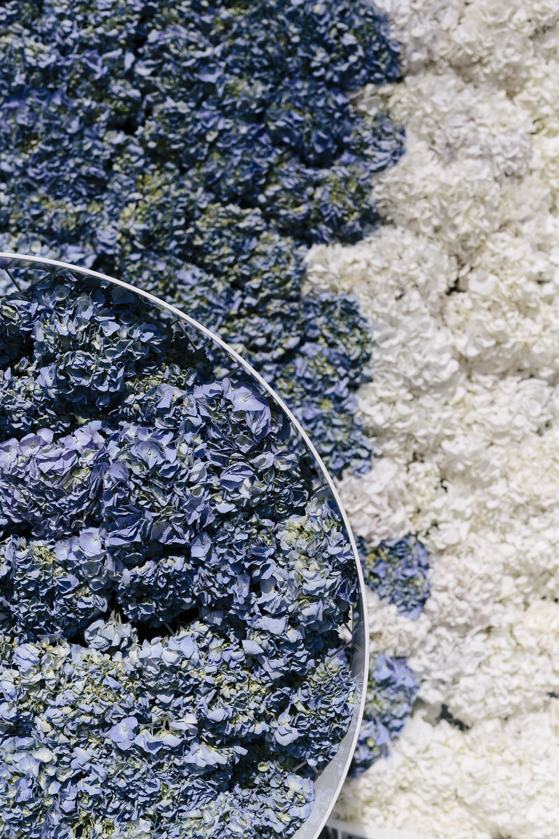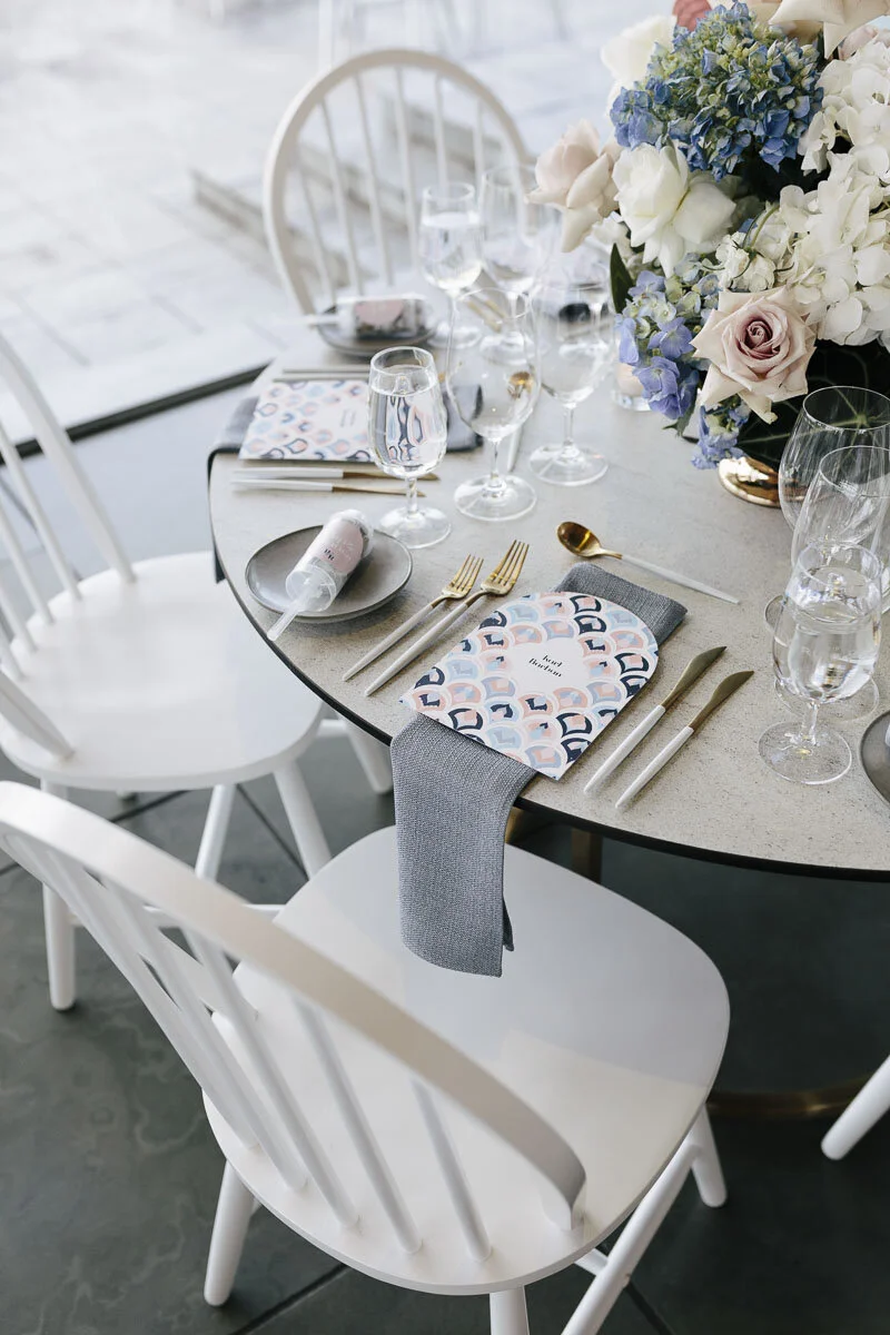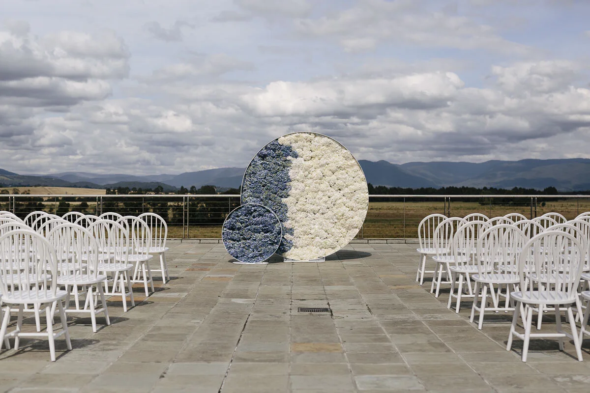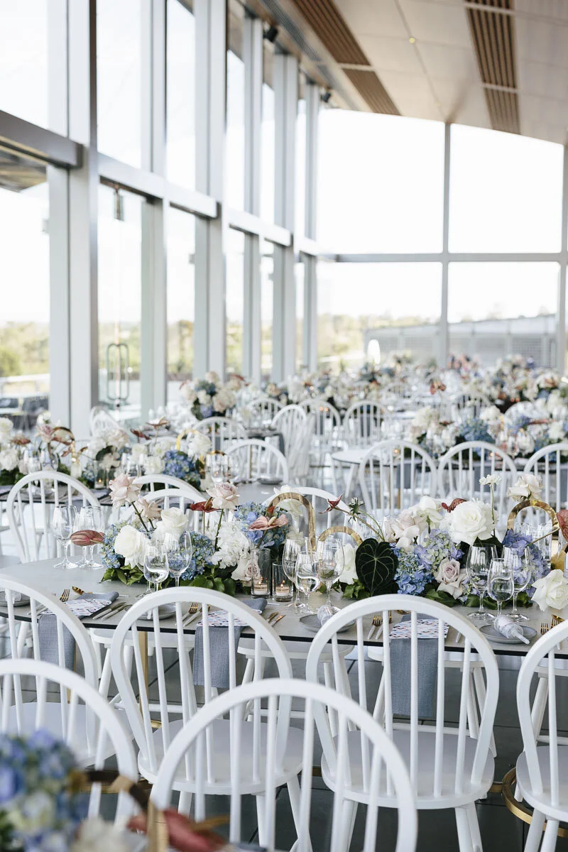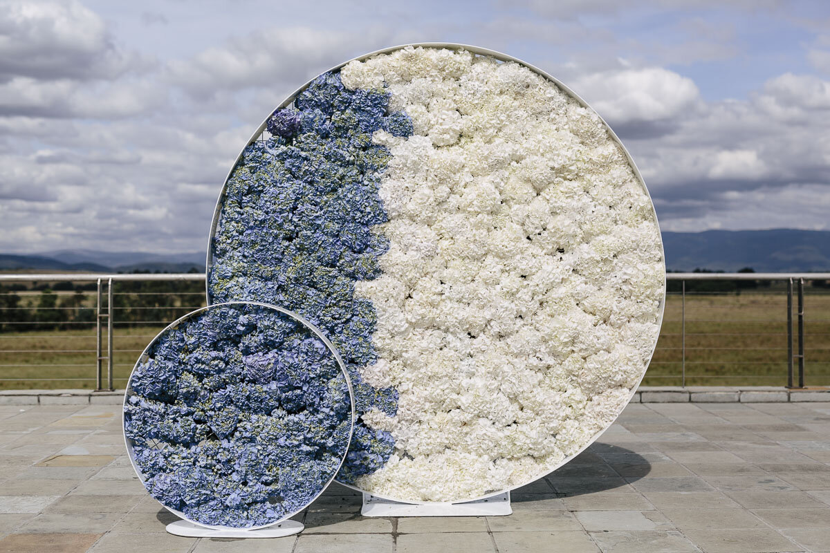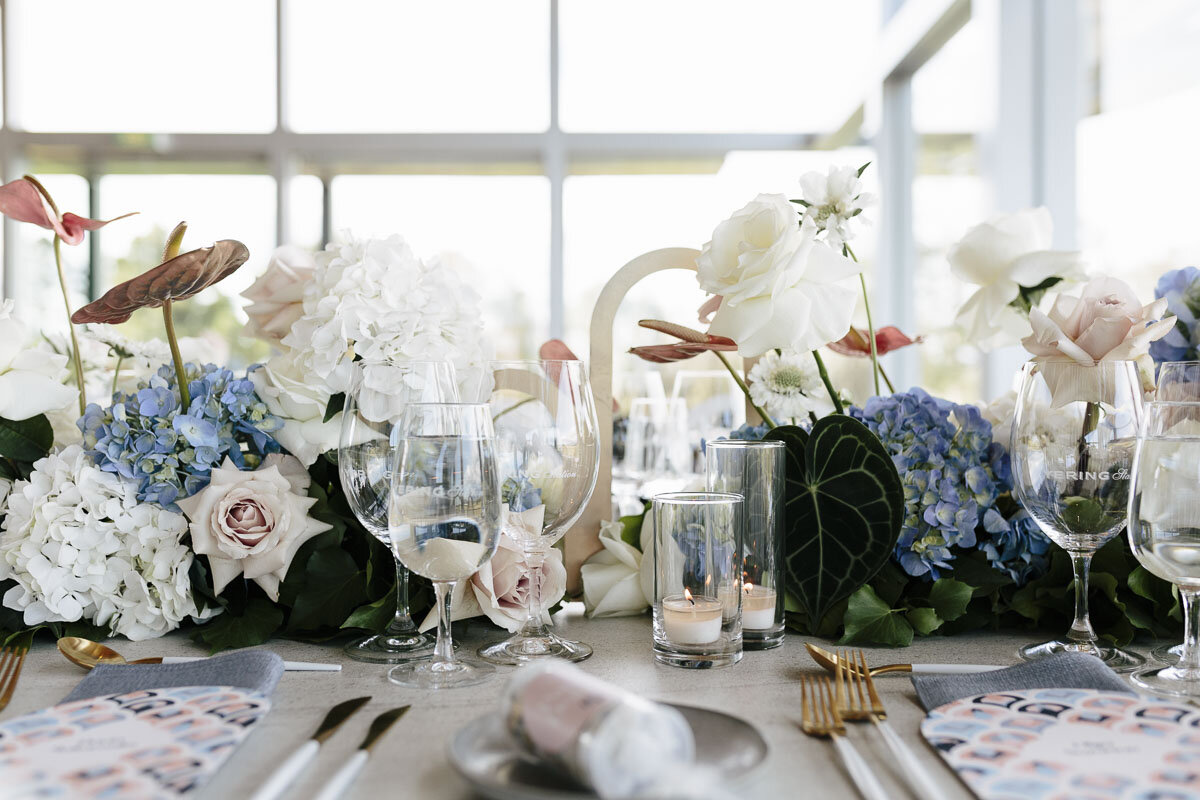 THE STUNNING SCENERY OF THE ROLLING VINEYARD WAS THE PERFECT CANVAS FOR THE DREAMY CEREMONY. THE CURVED BACKDROP WAS FILLED WITH CLOUD-LIKE BLUE AND WHITE HYDRANGEA. GUESTS WERE MOVED INTO THE DINING ROOM THAT WAS TRANSFORMED INTO PURE ELEGANCE. THE SPACE FEATURED ARCHED DETAILED CHAIRS, CURVACEOUS CONTEMPORARY TABLES, DUSTY BLUE NAPKINS AND TWO TONED WHITE AND GOLD CUTLERY. THE FLORAL DESIGN OF POWDER BLUE, CRISP WHITE AND HINTS OF METALLIC ADDED BEAUTY, ROMANCE AND TEXTURE. GUESTS SAVOURED THE MOMENT WITH CIGARS, WHISKY AND ELECTRO-ACOUSTIC SOUNDS INTO THE NIGHT.