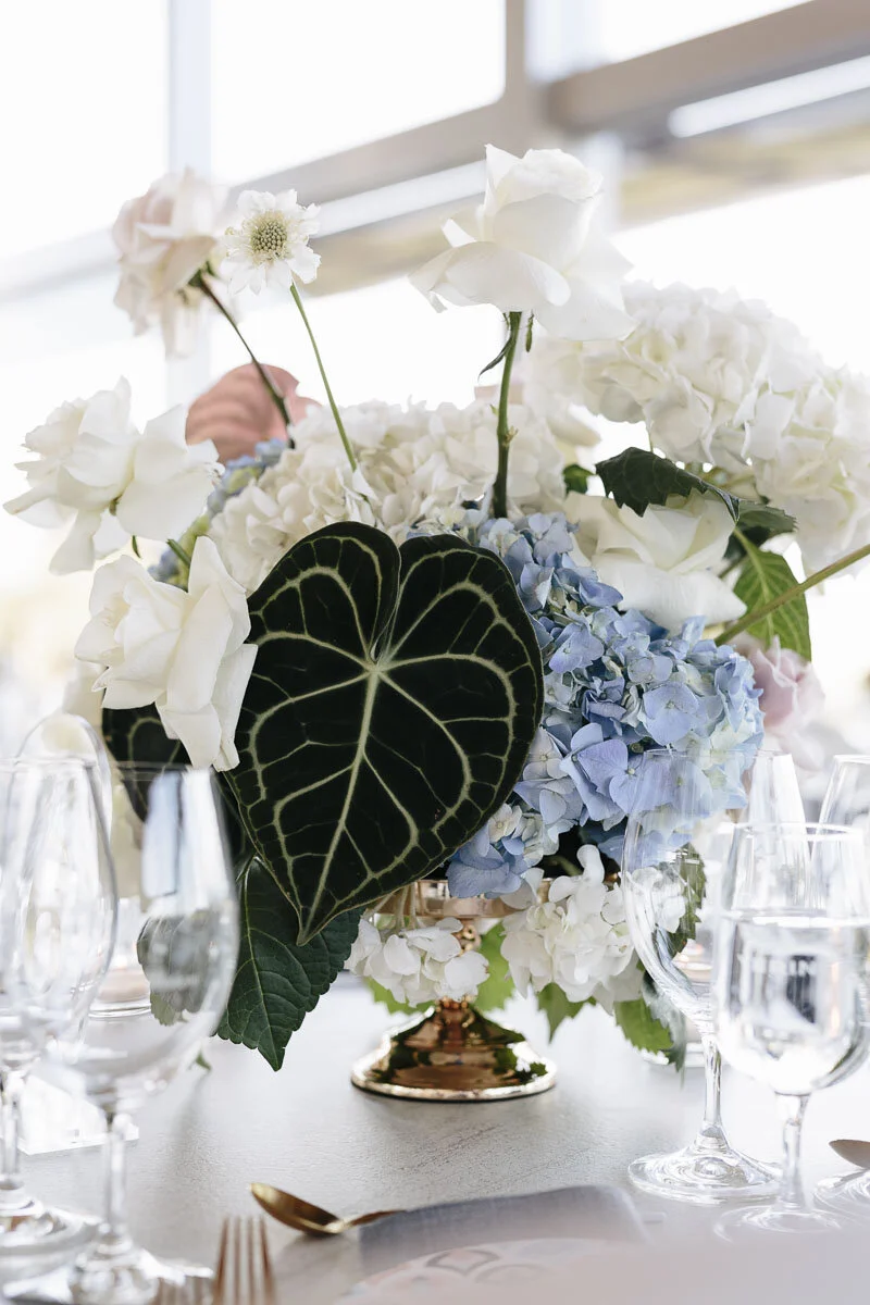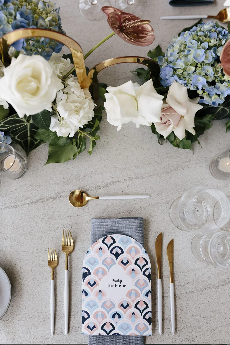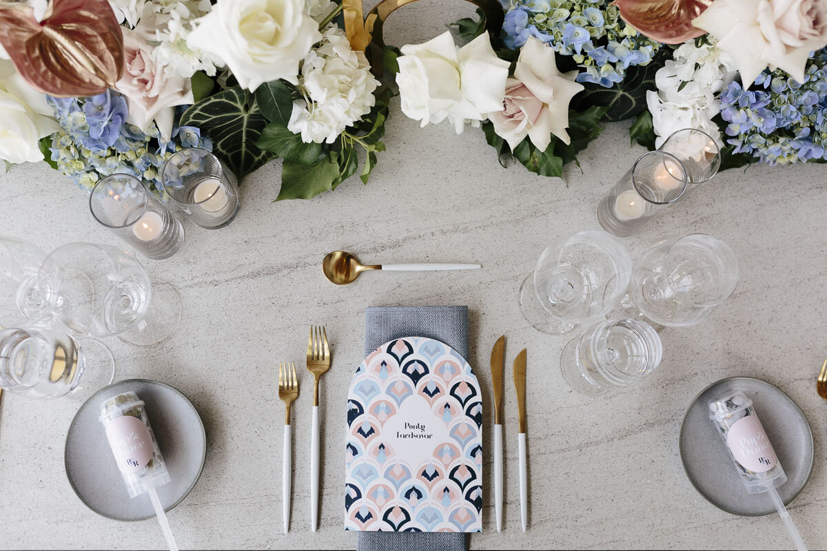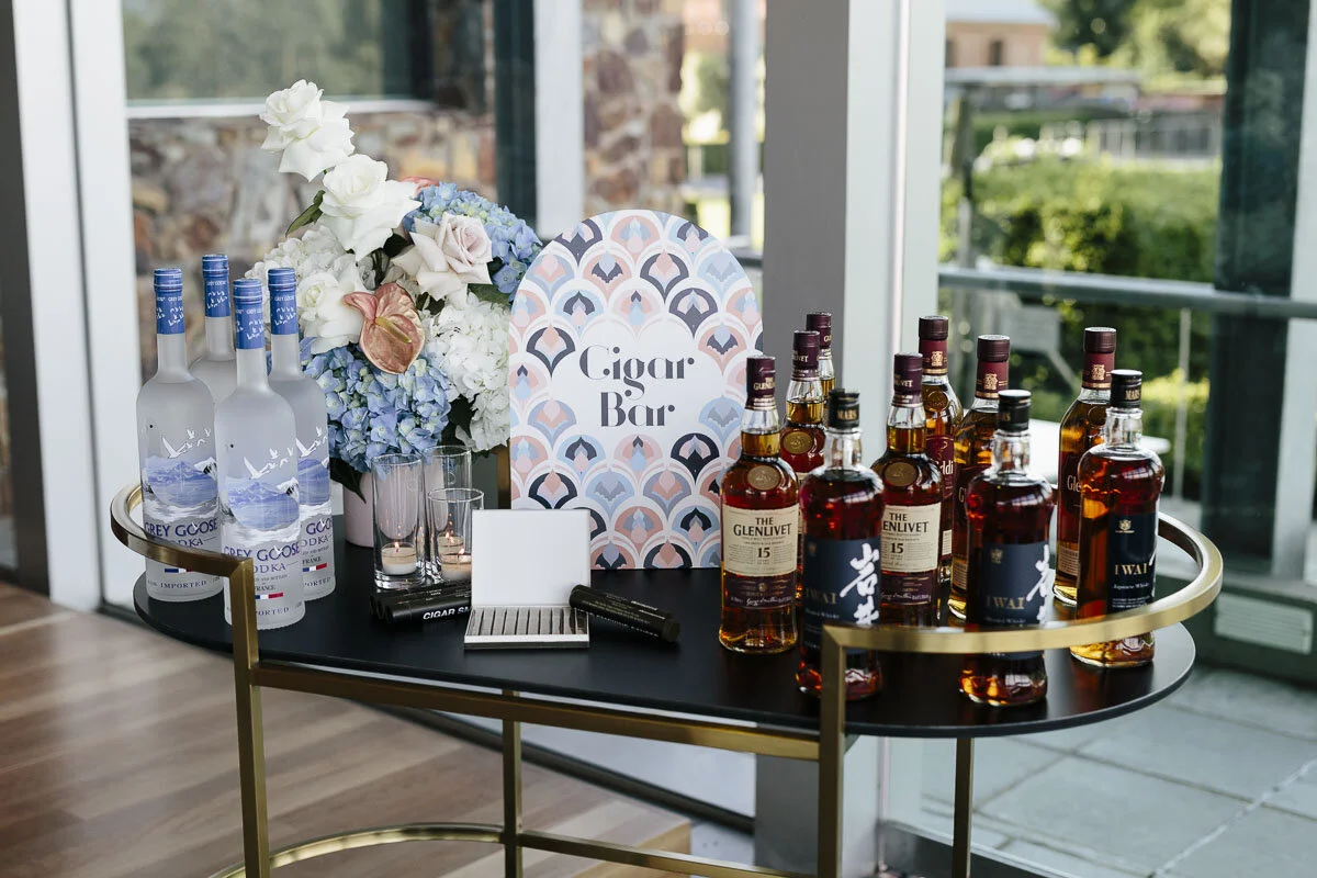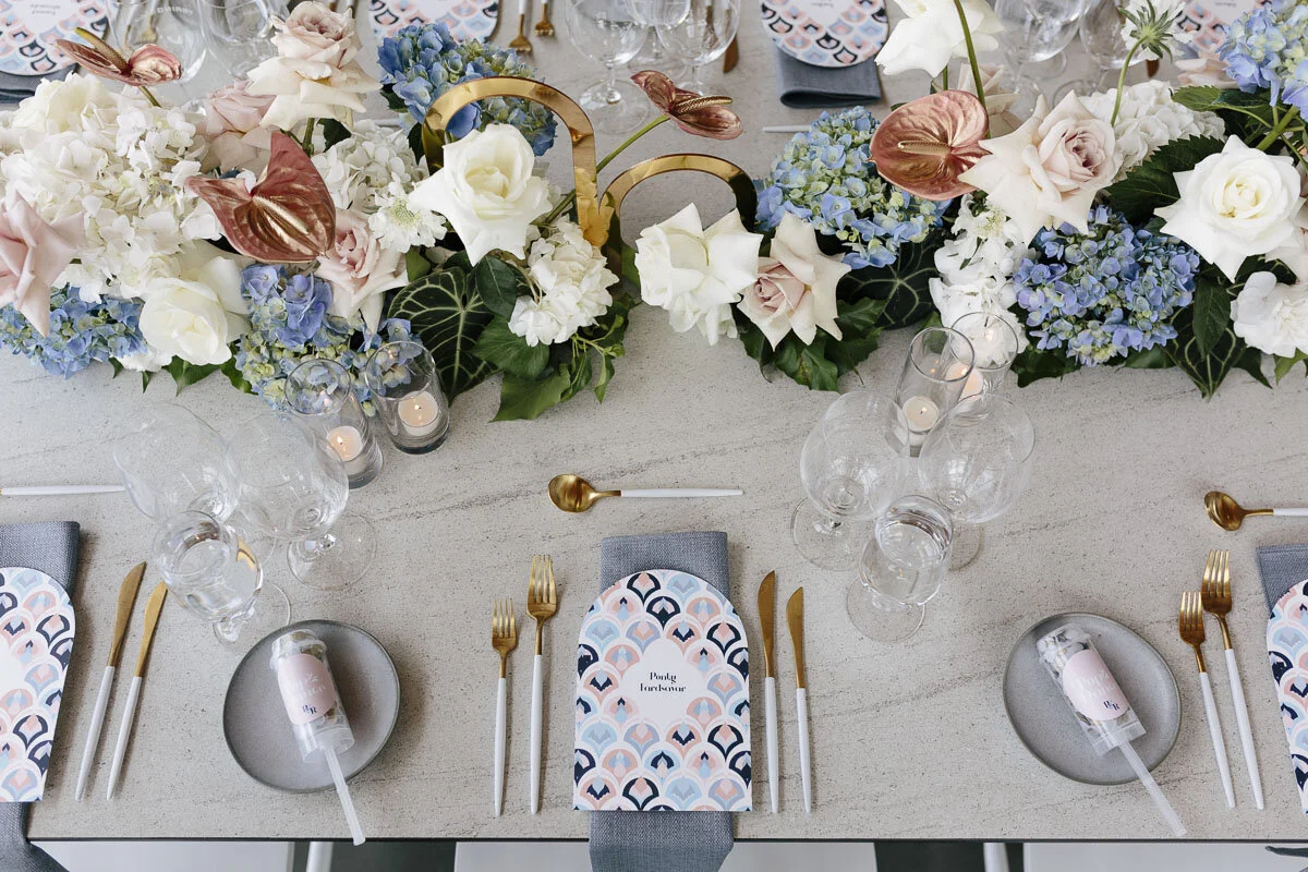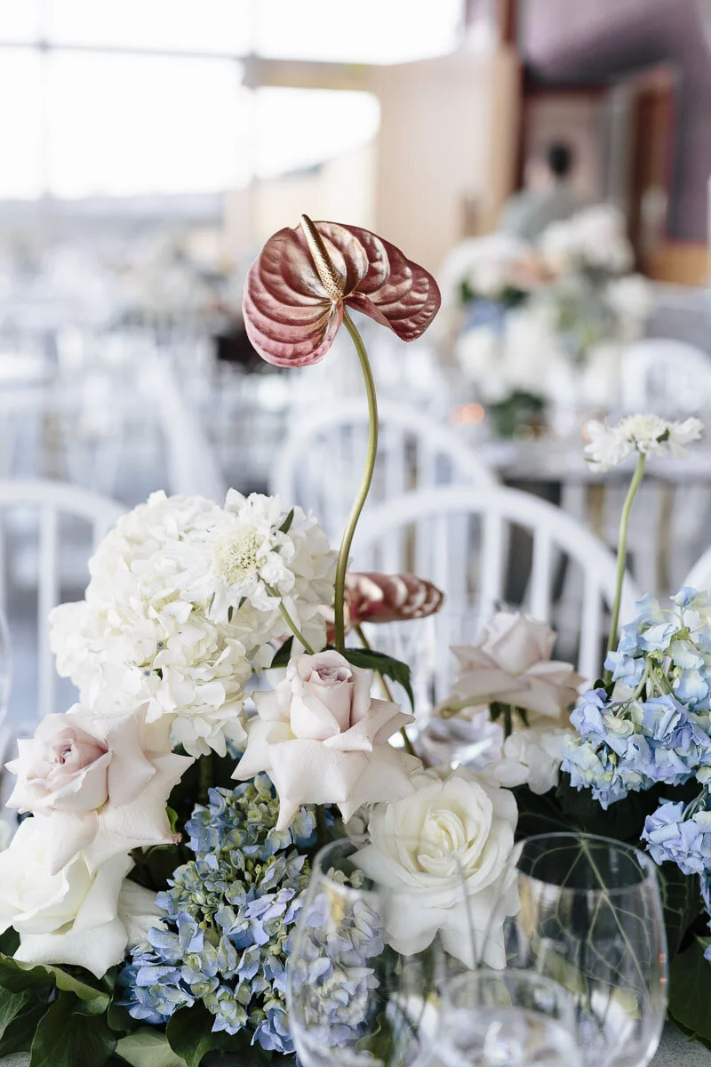 THE STUNNING SCENERY OF THE ROLLING VINEYARD WAS THE PERFECT CANVAS FOR THE DREAMY CEREMONY. THE CURVED BACKDROP WAS FILLED WITH CLOUD-LIKE BLUE AND WHITE HYDRANGEA. GUESTS WERE MOVED INTO THE DINING ROOM THAT WAS TRANSFORMED INTO PURE ELEGANCE. THE SPACE FEATURED ARCHED DETAILED CHAIRS, CURVACEOUS CONTEMPORARY TABLES, DUSTY BLUE NAPKINS AND TWO TONED WHITE AND GOLD CUTLERY. THE FLORAL DESIGN OF POWDER BLUE, CRISP WHITE AND HINTS OF METALLIC ADDED BEAUTY, ROMANCE AND TEXTURE. GUESTS SAVOURED THE MOMENT WITH CIGARS, WHISKY AND ELECTRO-ACOUSTIC SOUNDS INTO THE NIGHT.