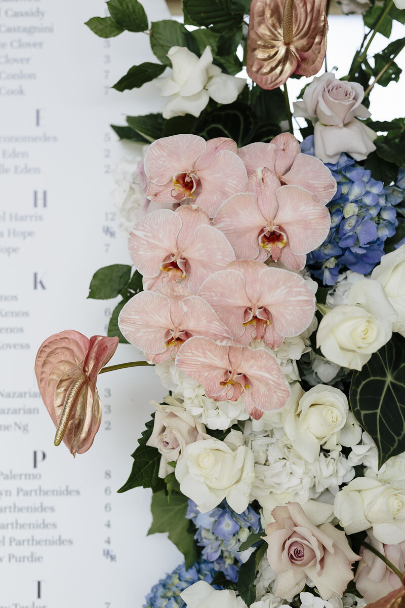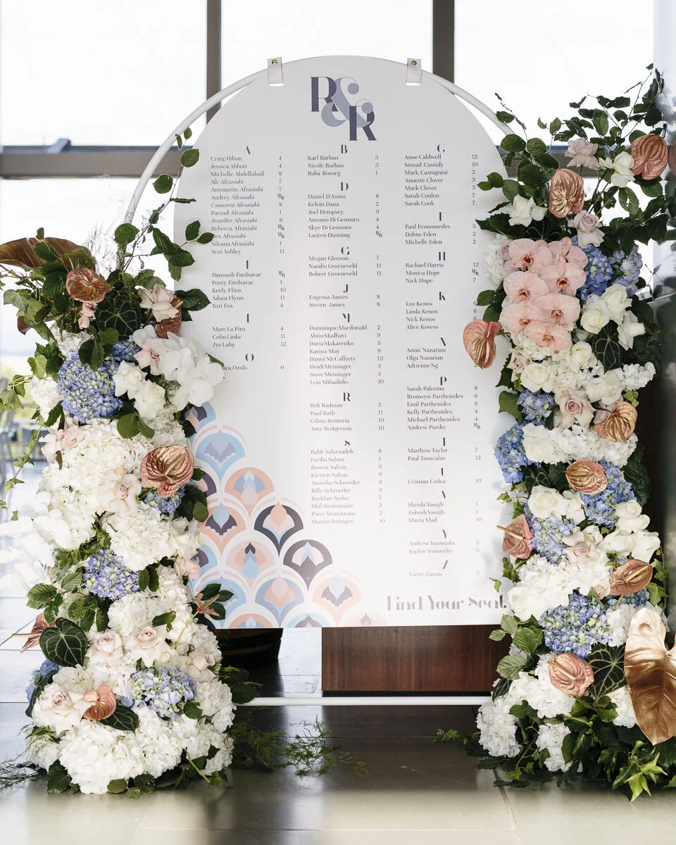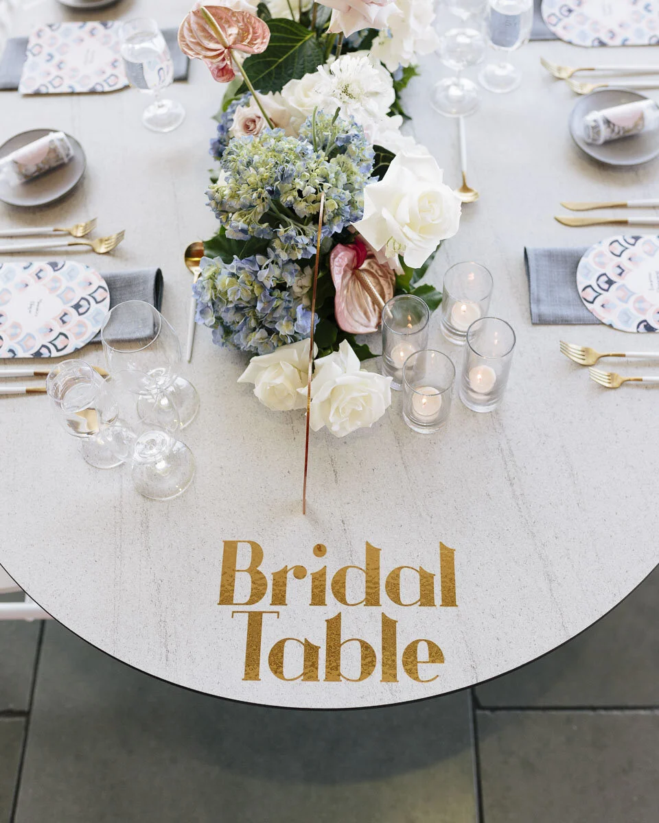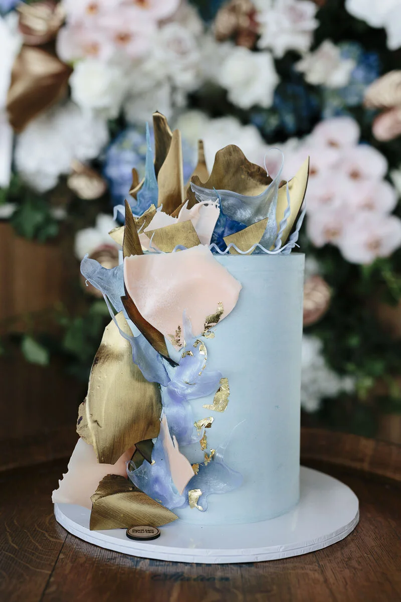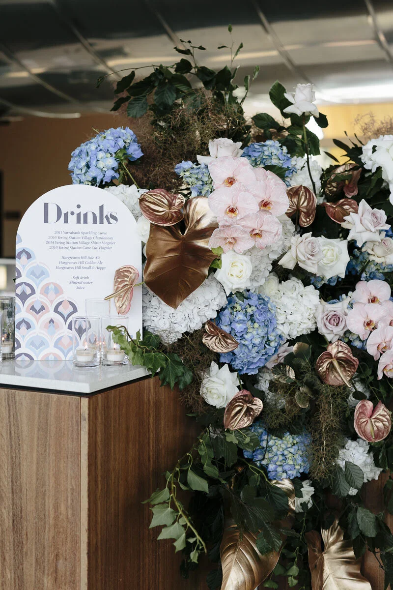 THE STUNNING SCENERY OF THE ROLLING VINEYARD WAS THE PERFECT CANVAS FOR THE DREAMY CEREMONY. THE CURVED BACKDROP WAS FILLED WITH CLOUD-LIKE BLUE AND WHITE HYDRANGEA. GUESTS WERE MOVED INTO THE DINING ROOM THAT WAS TRANSFORMED INTO PURE ELEGANCE. THE SPACE FEATURED ARCHED DETAILED CHAIRS, CURVACEOUS CONTEMPORARY TABLES, DUSTY BLUE NAPKINS AND TWO TONED WHITE AND GOLD CUTLERY. THE FLORAL DESIGN OF POWDER BLUE, CRISP WHITE AND HINTS OF METALLIC ADDED BEAUTY, ROMANCE AND TEXTURE. GUESTS SAVOURED THE MOMENT WITH CIGARS, WHISKY AND ELECTRO-ACOUSTIC SOUNDS INTO THE NIGHT.