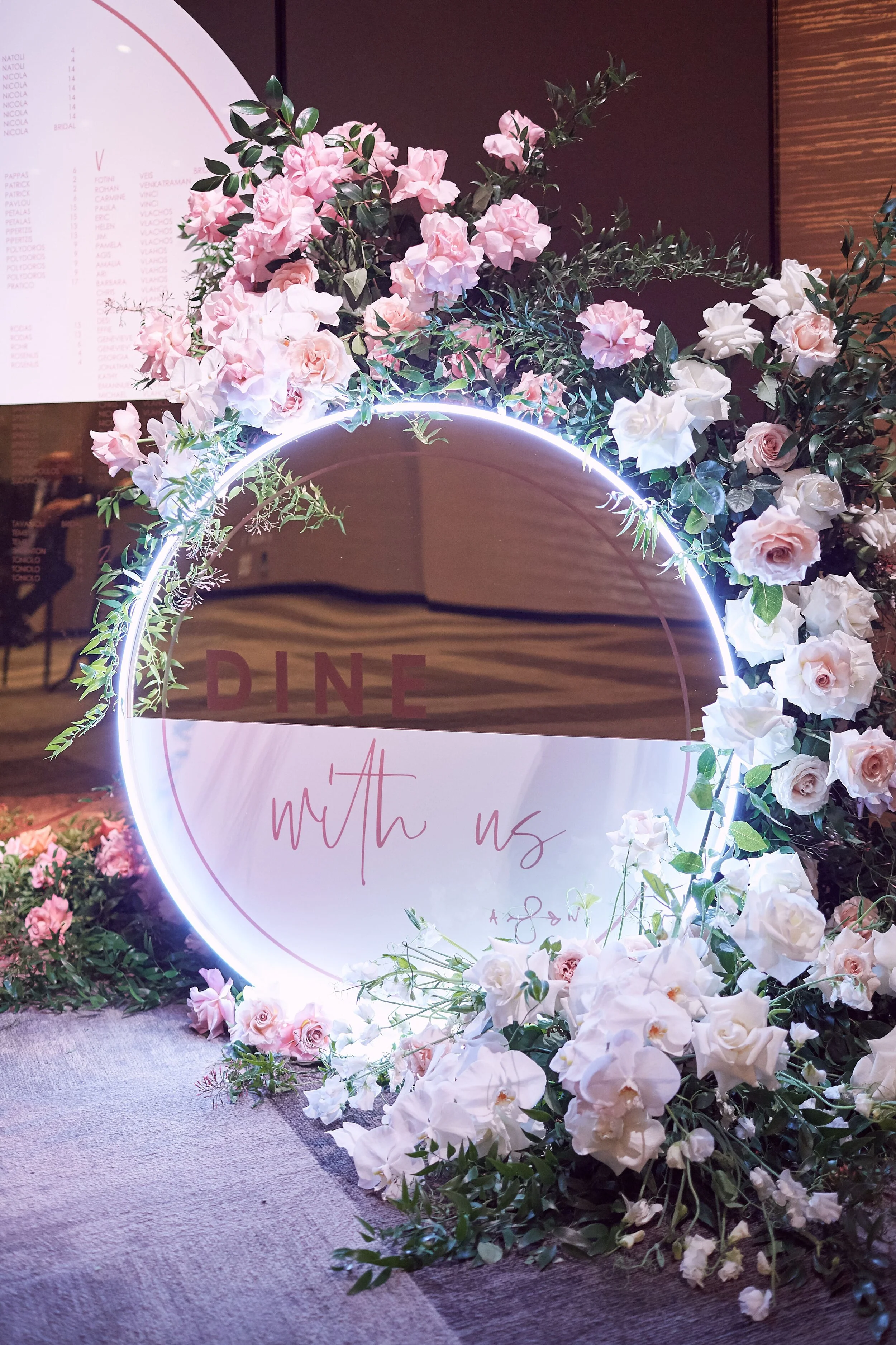 BLACK TIE GUESTS WERE TREATED TO A STATEMENT ON ENTRANCE, AN ILLUMINATED CUSTOM CIRCULAR SEATING CHART DESIGNED WITH GOLD MIRROR + WHITE ACRYLIC HAD GUESTS IN A FLUTTER OF EXCITEMENT TO FIND THEIR SEATS. THE BRIDAL PARTY DINED ON A BESPOKE TABLE CONTINUING ON THE CIRCULAR DESIGN, WARM LIGHTING AND STUNNING CASCADING ORCHIDS AND SOFT BLUSH FLORALS. THE DINING TABLES WERE TRANSFORMED INTO A POLISHED AFFAIR OF ELEGANCE WITH SHADES OF EMERALD GREEN ON THE VELVET CHAIRS, BESPOKE MENUS AND REFLECTIONS OF GOLD CUTLERY. GUESTS POURED ONTO THE GLOSSY WHITE DANCE FLOOR FOR THE TRADITIONAL GREEK DANCING, GUESTS DANCED THE NIGHT AWAY UNDER THE ART DECO INSPIRED LIGHTING FEATURE.