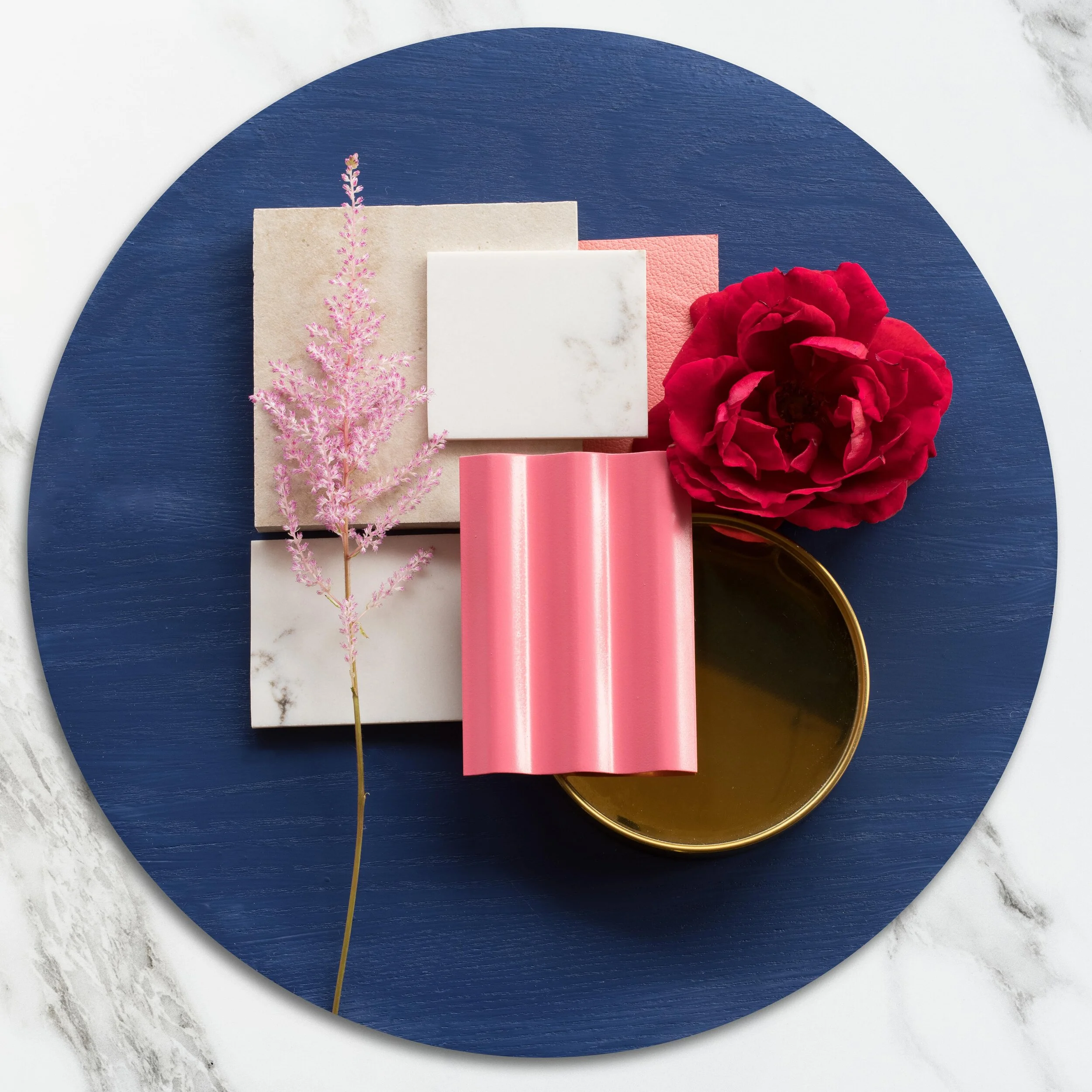 THE FLUTED ROMANCE DESIGN STARTED WITH A LOVE OF CURVES, WAVES AND FINISHES YOU WANT TO RUN YOUR HANDS ALONG. RICH, IMMERSIVE, BLUE CONTRASTING WITH BEAUTIFUL SOFT CHINTZ ROSE ADS LINE, FORM AND A SENSE OF LUXURY TO THE SPACE. ALLURING FURNITURE PIECES WITH PLUSH VELVET, TEXTURED LEATHER AND SMOOTH TRAVERTINE STONE WORK HARMONIOUSLY TOGETHER ON TOP OF A RUG THAT YOU WUOLD THINK IS MADE FOR THIS SPACE. THANKS TO THE FOLLOWING BRANDS FOR THEIR SUPPORT ON OUR FIRST SPACE FLIP