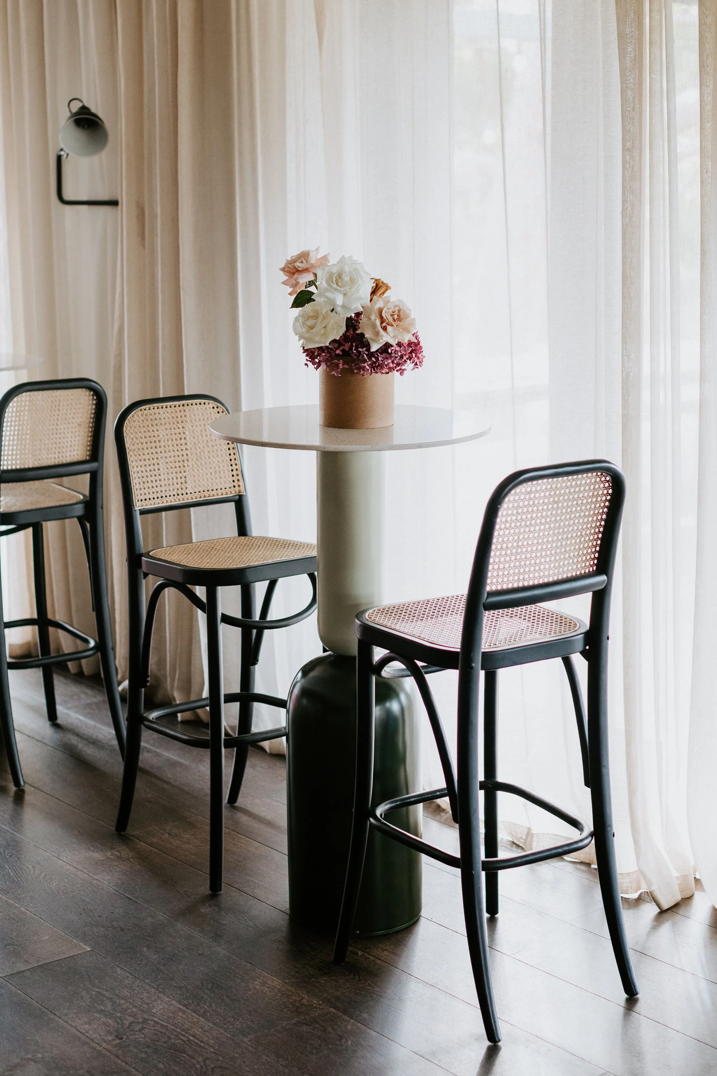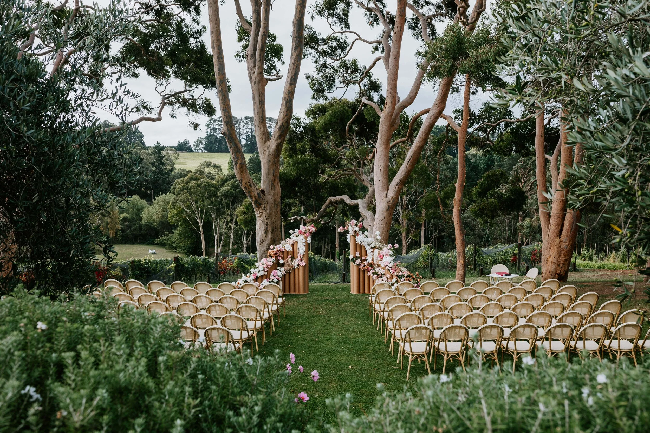 A GARDEN PARTY WEDDING FOR THE LOVERS OF NATURE. THE BESPOKE DESIGN WAS INSPIRED BY THE BEAUTIFUL LANDSCAPE OF POLPERRO WINERY AND THE TOWERING CYLINDRICAL GUM TREES. THE REFINED CURVED TUBE STRUCTURES WERE CRAFTED TO EMULATE THE NATIVE GUM TREES, PROVIDING A GROUNDED TONE AND A SENSE OF UNDERSTATED ELEGANCE TO THE SETTINGS THAT WERE BACKED WITH SWEET SOUNDING ACOUSTIC SOUNDS. THE FLORALS WERE ORGANIC YET POLISHED IN FORM, DRIPPING FROM THE STRUCTURES AND CASCADING ONTO THE GROUND. FURNITURE IN DUSTY ROSE AND OLIVE HUES ELEVATED THE NATURAL SURROUNDINGS ALLOWING GUESTS A TIME TO SOAK IN ALL THE LOVE. THE OVERFLOWING CHAMPAGNE TOWER WAS POURED AND GUESTS WERE TREATED TO BRASSY SAXOPHONE SOUNDS. PHOTO LOVERS POSED IN FRONT OF THE FEATURE WALL WHICH MIRRORED THE GARDEN PARTY SETTING WITH BOTANICAL DESIGNS, A MOMENT TO REMEMBER IN THIS FAIRY TALE.