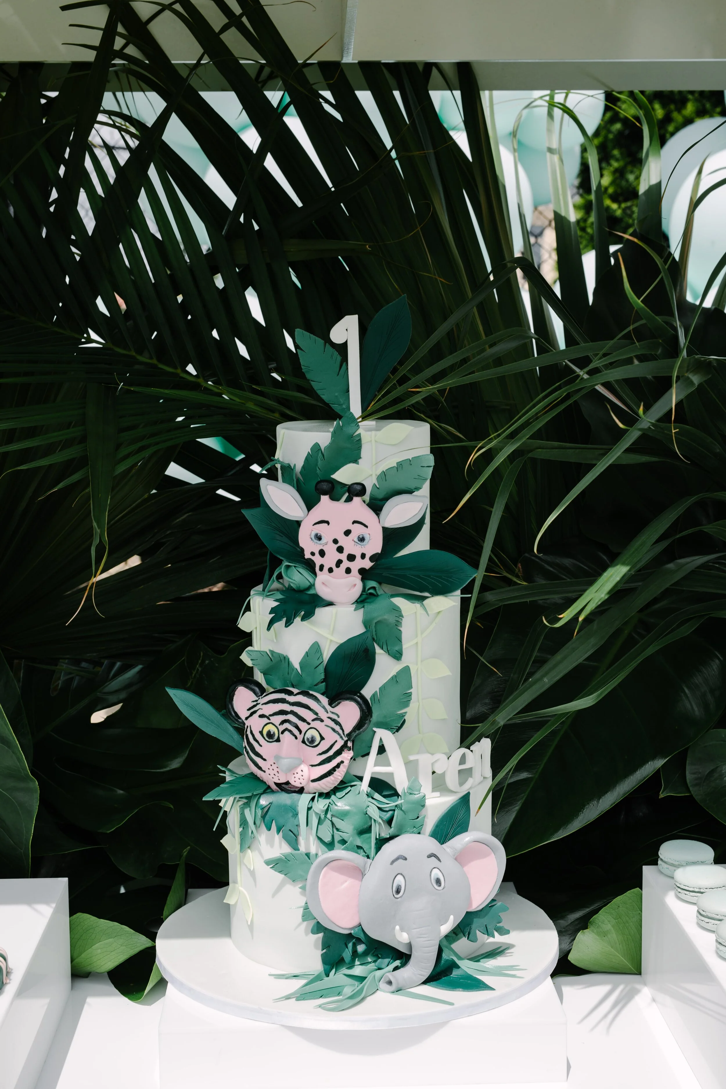 A LOVING CELEBRATION THAT WAS DOUBLE THE FUN. IN THE NEVER-FAIL COLOUR COMBO OF PINK AND GREEN, THE LIVELY BALLOON INSTALLATION CREATED BOTH STYLE AND ATMOSPHERE. THE JUNGLE SETTING ALLOWED THE LITTLE ONES TO EXPLORE WITH THE WILD ANIMALS, JUMP ON THE BOUNCY CASTLE AND CREATE A MASTERPIECE ON THE GIANT COLOURING WALL. WHILE THE TODDLERS PLAYED, THE YOUNG ADULTS SIPPED ON CHAMPAGNE IN A PARISIAN SETTING AND PERFECTED THEIR SELFIE SNAPS IN FRONT OF THE BESPOKE FLORAL PRINT WALL. CENTRAL TO THE CELEBRATIONS WERE DECADENT DESSERT CARTS FILLED WITH HAND CRAFTED SWEET TREATS AND CAKES IN DREAMY MINT AND PASTEL PINK HUES.